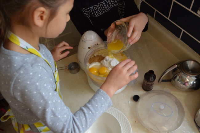 That way, the egg will just slide down onto the plate if they don’t get it into the bowl properly, and you can relax. Teach them the trick of using half an egg shell to fish out bits of broken shell from the bowl. Then dump the eggs into your batter slowly, and often the little egg bits will be left at the bottom.