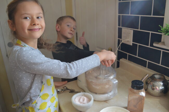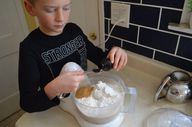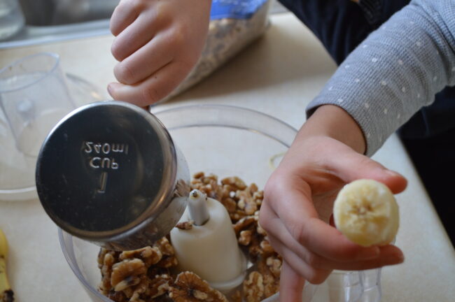Kids love a special tool: step stools, aprons, spatulas, measuring spoons and cups. If you can manage to keep these things where kids can reach them on their own, even better. We tend to use an 8-cup food processor instead of a mixer because we use ground nuts a lot, so it obviously requires a good amount of supervision (as do knives, stoves, and ovens). But kids love to have their own aprons and a step stool that helps them be at the right height. Don’t try to have the kids share one–at least my children cannot handle sharing a step stool for more than a minute. (Obviously, children continue to grow taller, so what worked well one year may be too tall the next.)