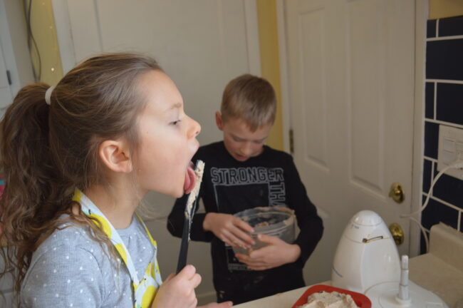 Cooking with children can be an academic activity. They can practice reading the measurements. (I would recommend double-checking their ability to read fractions and the difference between a tablespoon and a teaspoon, however! 1/2 teaspoon of baking soda being misread as 2 tablespoons could be a pretty dramatic misreading.) The kids can write the recipe out on an index card for handwriting/copy work (and creating their own recipe box). You can work on fractions and addition (especially if you are doubling the recipe). You can talk about chemical reactions with baking soda and yeast. Cooking can be a morning of homeschool (even if, like us, you don’t technically homeschool!). Or not. Remember, you are in charge, and sometimes just letting them do the fun parts and then running off to let you have some peace and quiet is ok too.
