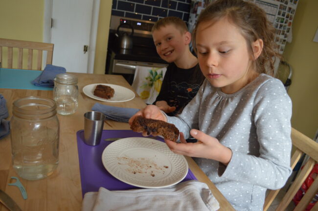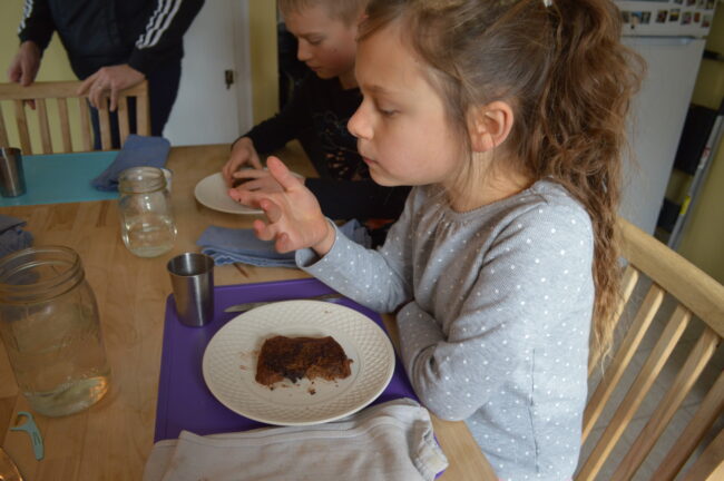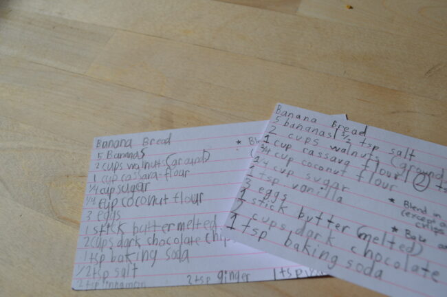 The next weekend, we realized that it was the 10th anniversary of Jackson’s baptism. To celebrate, Jackson, Lily, and I made a second batch of banana bread. (And I took pictures this time.) Since Jackson and I had just made it, it went much smoother. The kids were so happy to grab their own recipe cards and read the recipe aloud from them.