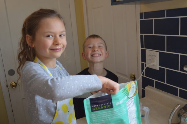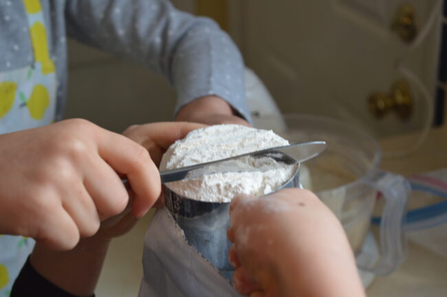 Cooking with kids is better if they aren’t bickering about who gets to do what. Kids love to measure. If you have two kids, they both will want to measure and dump. They will want it to be “fair” and to dump the same number of things. If you need a cup of flour, try using a 1/2 (or even a 1/4!) cup and letting each kid do half. It is slower and not important to adults, but try to remember that this is one of the most important and fun parts of cooking for kids! Lily is also crazy about using a knife to level dry goods. (Which I admit, is oddly satisfying.)
