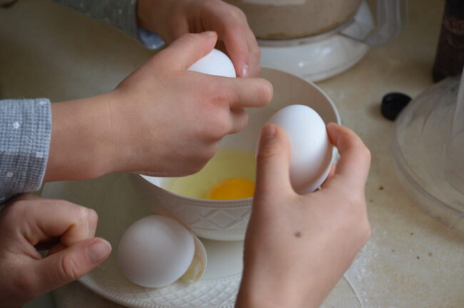 Cooking with children is better if you are relaxed, and they have the freedom to try something. So mess management is key. For eggs, put a plate underneath a smaller bowl for your kids to crack eggs into. (Bonus if you have a second bowl for the shells to go into if the garbage is too far away.)