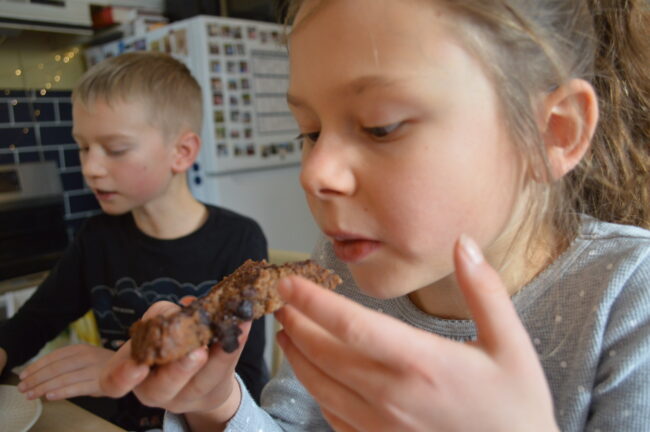 The goal is to have children who know how to cook delicious, nutritious food for themselves and those they love by the time they move out, or at least to have the skill base to learn to do so as young adults. We are all still learning how to cook! Every few years, I have something that makes me feel like I’m learning all over again. (A change in diet, a new stove, tiny children, growing children, crazy expensive eggs or beef, etc.). One way to help kids be more involved is to have a few cookbooks around (or check them out from the library), where you’d pretty much say “yes” to any recipe. Since our kids are both gluten-free and Lily is pretty much dairy-free (butter and whey powder are ok, so it’s probably a lactose issue), we like paleo books. Our kids love Eat Like A Dinosaur. Then we have to walk through the process from picking out a recipe, to shopping for special ingredients, to planning a time to make it. And even though they always pick out the dessert recipes, it’s still laying the foundation for a lifetime of healthy eating, because cooking at home is one of the healthiest things you can do.